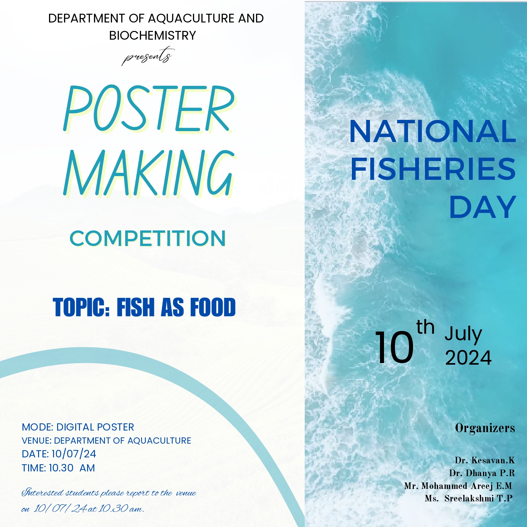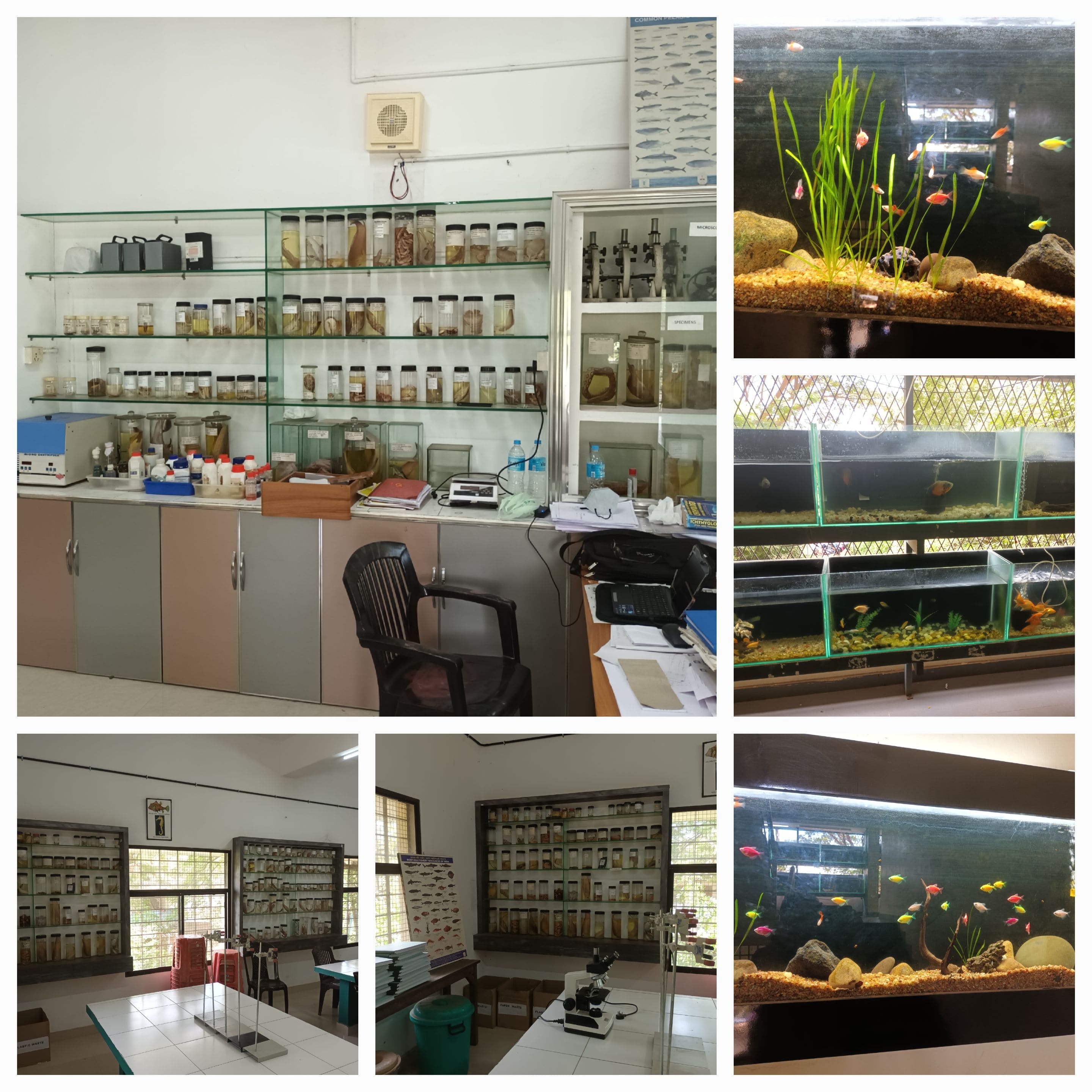 • Establishment and History:Renowned fishery scientist late Dr. K.H. Alikunhi, (1918 -2010), Former Director, Central Institute of Fisheries Education (CIFE), Mumbai and former consultant to FAO and native of Eriyad, Kodungallur took active interest in instituting the department and beginning of B.Sc. Programme in Aquaculture. The Department was established in 1995. Dr. C A Ignatius (Retd.) was the first faculty and first HoD at the time of establishment of the department. Dr. S Sureshkumar (presently Professor of Aquaculture, Kerala University of Fisheries and Ocean Studies) joined as faculty in 1999. Dr. Sureshkumar got transferred to M E S Ponnani College, Ponnani in the same year. Sri. Shibu A Nair and Dr. Kesavan K joined as new permanent faculties in July 1999. After the retirement of Dr. C A Ignatius in 2018, Dr. Kesavan K took over charge as Head of the Department. Dr. Dhanya P R joined as new permanent faculty in December 2018. Smt. Sreelakshmi T P joined as Guest faculty in 2022. The current total faculty strength is four. The department now offers B.Sc. Programme in Aquaculture and two add-on courses (Field Practices in Fisheries and Climate Smart Aquaculture) and Competitive Examination Coaching for IIT- JAM.Open courses offered is Value Added Fishery Products (2021 – 22 onwards). The department has formerly conducted UGC aided Add-on Course in Ornamental Fish Culture (2016-17 to 2018-19) and Certificate Course in Aquarium Management. B.Sc. Aquaculture programme (with Zoology and Biochemistry as Complementary courses) is an aided one affiliated under University of Calicut and it got permanent affiliation as regular programme in 1998. The course was restructured in 2009 under choice based credit and semester system (CUCBCSS). Yet another revision of syllabi occurred in 2014 at the time of introduction of CUCBCSS system by the affiliating University. The recently updated curriculum with OBE perspective (CBCSS) is in place since 2019. • Overview of B.Sc. Aquaculture Programme:Being an institution that comes under minority status and the geography of a coastal belt where the college is located, the undergraduate Programme offered by the department namely B.Sc. Aquaculture (aided programme) is a tailor-made one helping in the career attainment and/or self employment of the students. The course is in tune with the stated vision of Muslim Educational Society. The locale of the College is thickly populated with fishermen community or people depending on fishing as their livelihood. A lion part of student clan of the department is from such families. • Salient Features of the Department: The department has two well-set laboratories, ICT enabled classrooms, fish culture tanks and aquaria. An eight-foot longplasma aquarium is a highlight among indoor glass aquaria. In addition to world class teaching of theory and practicals, the students are offered with essential training programmes in all segments of fisheries, aquaculture and fish processing. Field Visits, Academic Study Tours and Project Works are mandatory components of the curriculum. Major equipments in the department include Laminar Flow Chamber, Autoclaves, high speed and medical centrifuges, research microscopes, Trinocular microscopes, Digital Colony Counter, TDS meter, Refractometer, Tissue homogeniser, Precision Chemical Balance, Protein Skimmers etc.